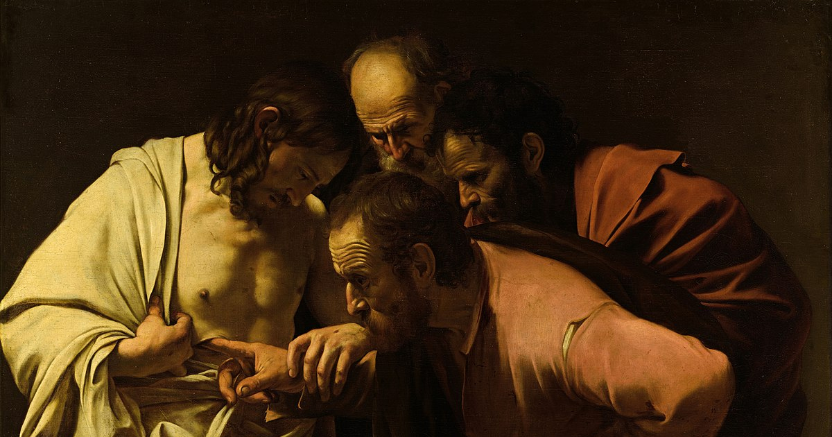 I nakon osam dana bijahu njegovi učenici opet unutra, a s njima i Toma. Vrata bijahu zatvorena, a Isus dođe, stade u sredinu i reče: »Mir vama!« Zatim će Tomi: »Prinesi prst ovamo i pogledaj mi ruke! Prinesi ruku i stavi je u moj bok i ne budi nevjeran nego vjeran.« Odgovori mu Toma: »Gospodin moj i Bog moj!« Reče mu Isus: »Budući da si me vidio, povjerovao si. Blaženi koji ne vidješe, a vjeruju!«
